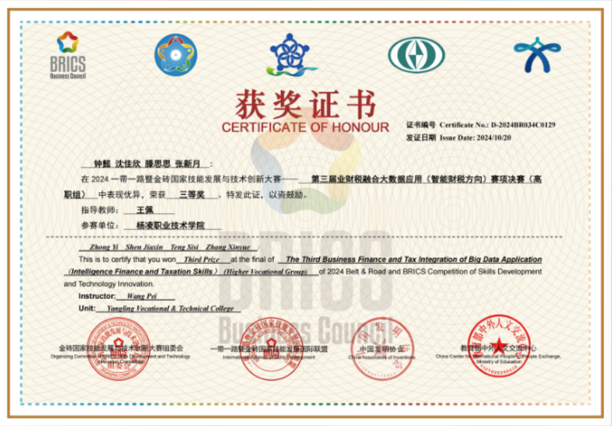9月20至22日,由金砖国家工商理事会中方理事会与教育部中外人文交流中心联合主办,安徽审计职业学院承办的2024一带一路暨金砖国家技能发展与技术创新大赛——第三届业财税融合大数据应用(智能财税方向)赛项国内决赛落下帷幕。共有来自全国58支高职院校代表队参加,浦京经济与贸易学院钟懿、沈佳欣、腾思思、张新月等四名学生获高职组团队赛三等奖。