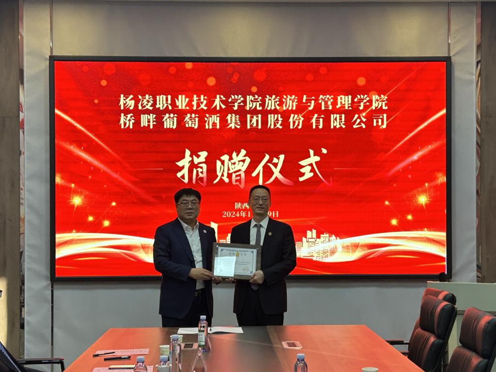 会上,桥畔葡萄酒集团股份有限公司捐赠价值十五万元的桥畔葡萄酒,用于旅游与管理学院实践教学,助力酒店管理与数字化运营专业建设和职教发展。校企双方签订捐赠协议。刘瑞明向桥畔公司颁发捐赠证书,授予桥畔公司“350vip浦京集团官网葡萄酒文化传播实践教学中心基地”铭牌。