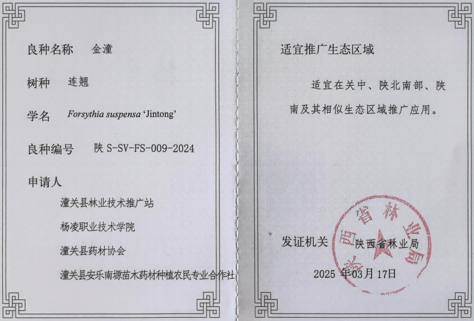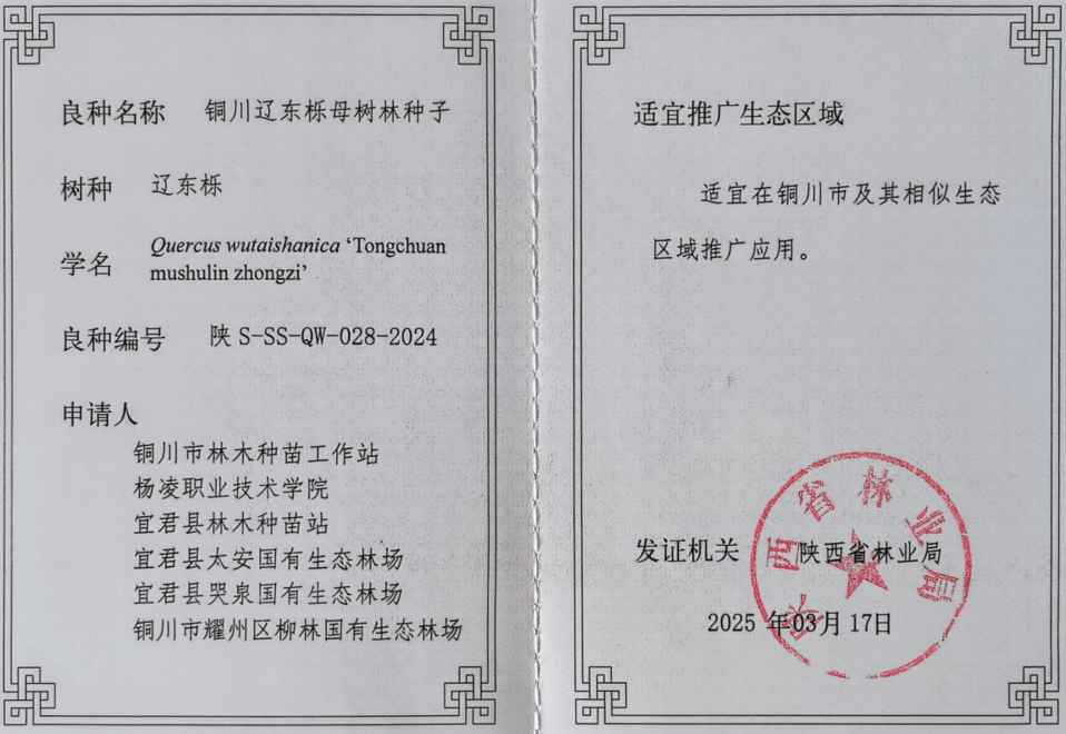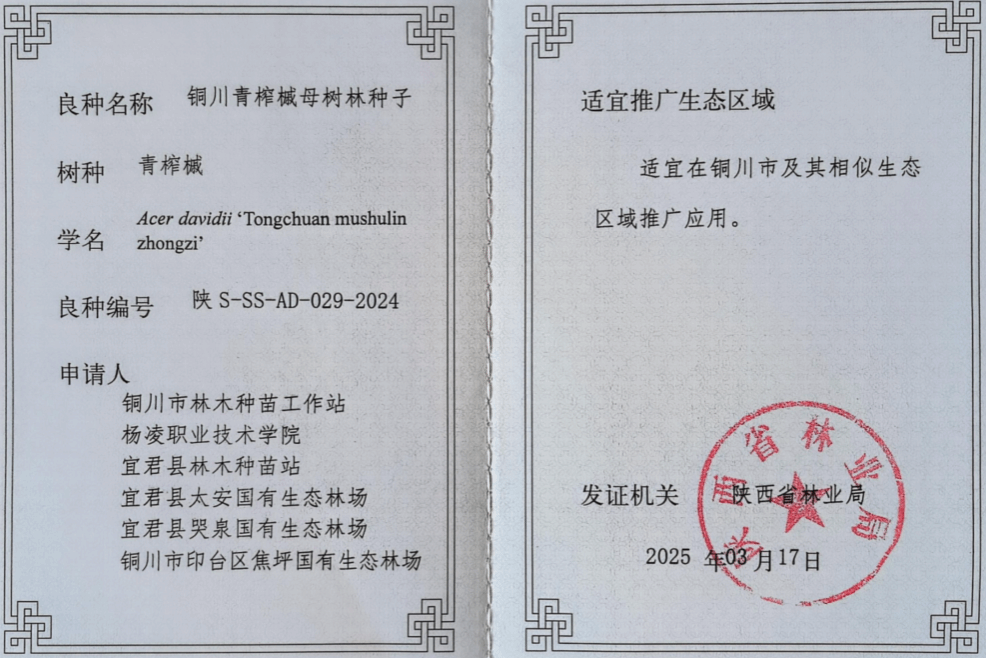 近日,陕西省林业局发布了2024年度陕西省林木良种名录公告,由浦京生态环境工程学院钱拴提教授团队联合多家单位选育的“金潼”连翘(学校选育人:张莹,钱拴提,王泽源)、“铜川辽东栎母树林种子”(学校选育人:张莹,钱拴提,余鸽,韩东锋,王青宁)、“铜川青榨槭母树林种子”(学校选育人:张莹,余鸽,韩东锋,王青宁,钱拴提)3个林木良种通过审定。