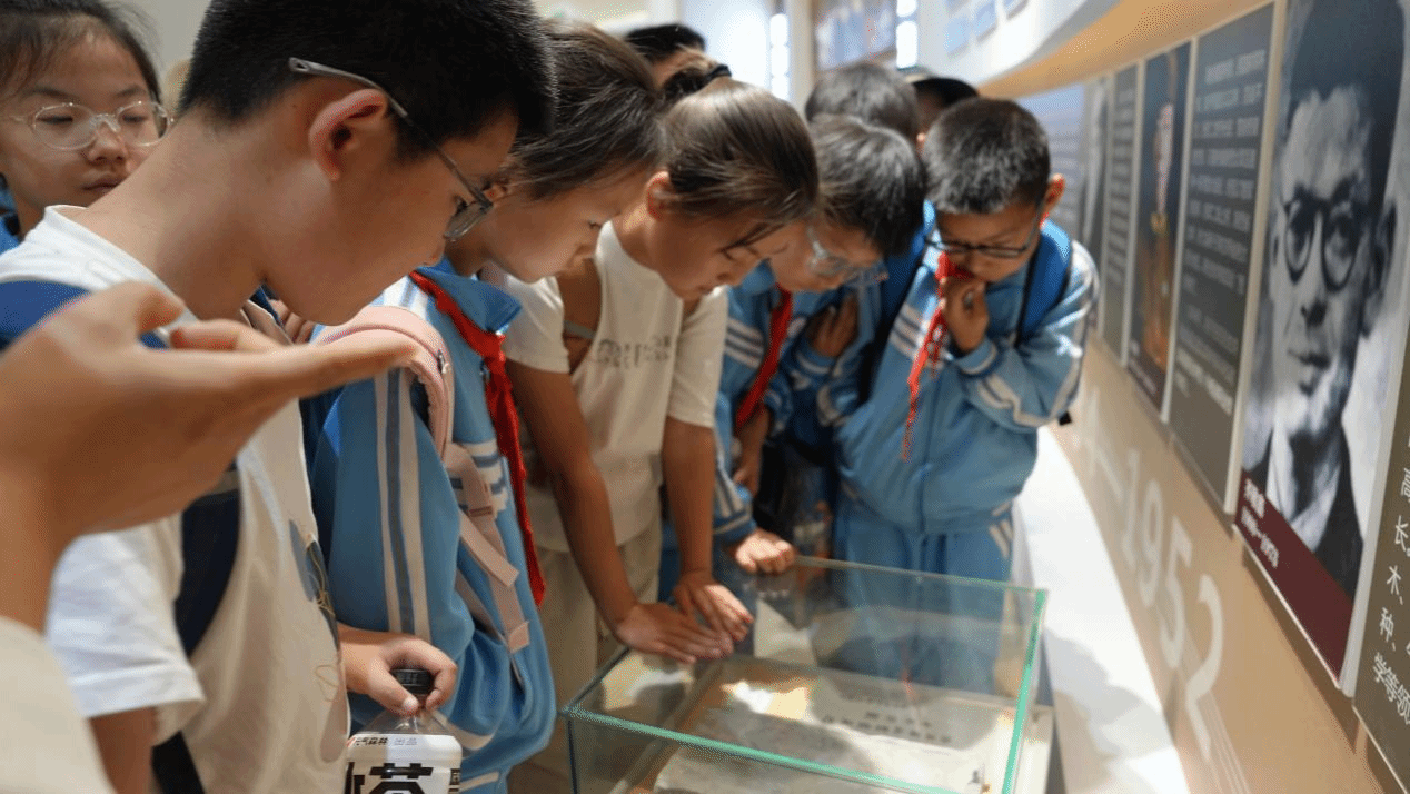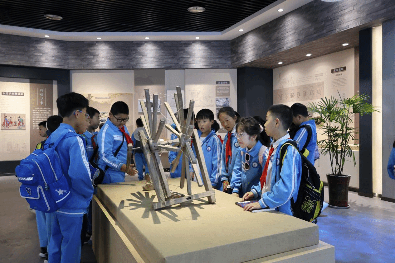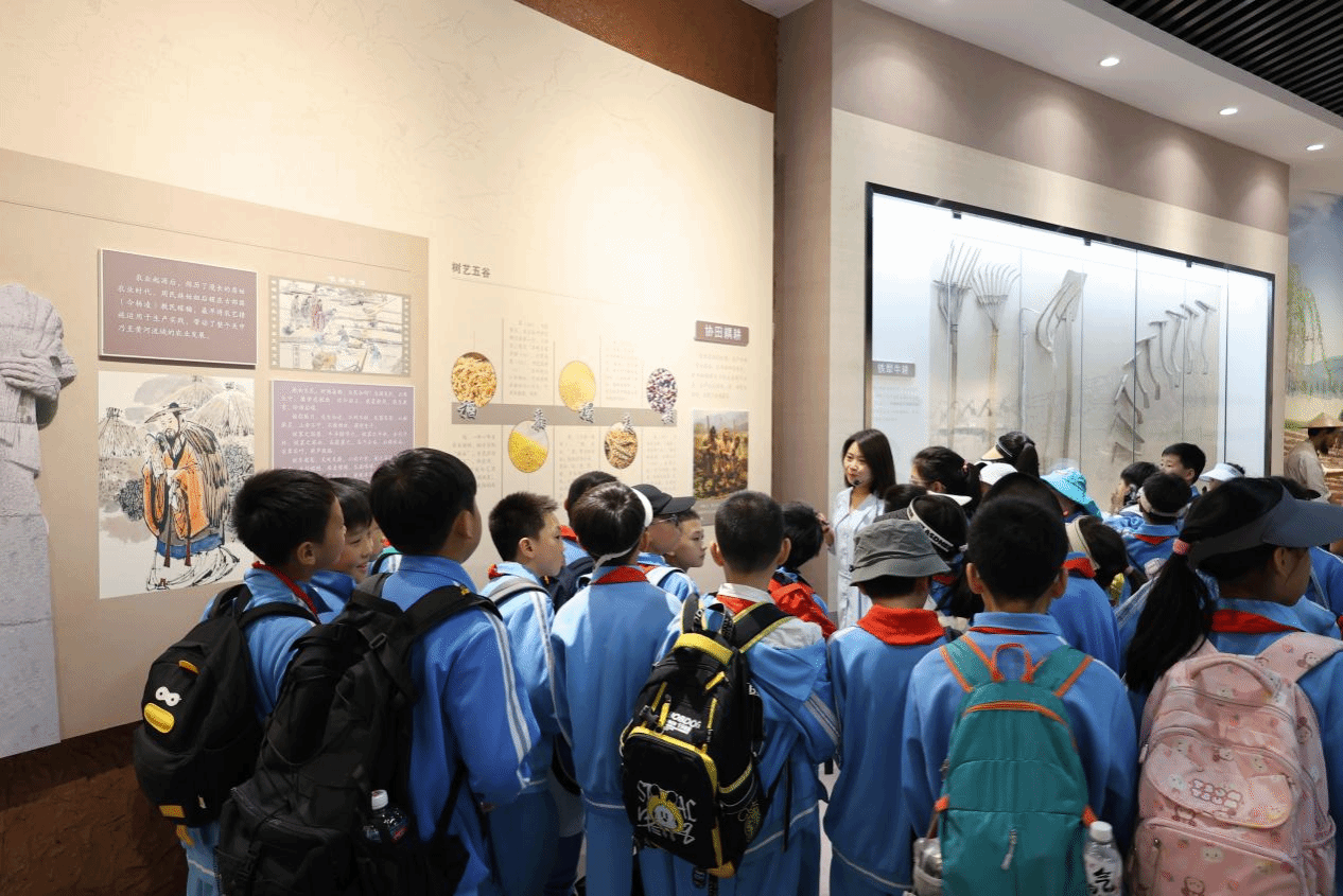 在校史馆,学生们沉浸式感受学校91年办学历程;耕读文化馆内,学生们看到镰刀、连枷、曲辕犁、纺车等展陈的实物农具,纷纷感慨古代劳动人民劳作的辛勤;“二牛抬杠”的模拟场景让古人智慧“触手可及”;讲解志愿者带领学生们朗诵“二十四节气歌”,并通过观看动画短片《耕读:农耕文明传承千年的基因密码》,系统梳理了农耕时期农业技术的发展脉络,厚植知农、爱农情怀。