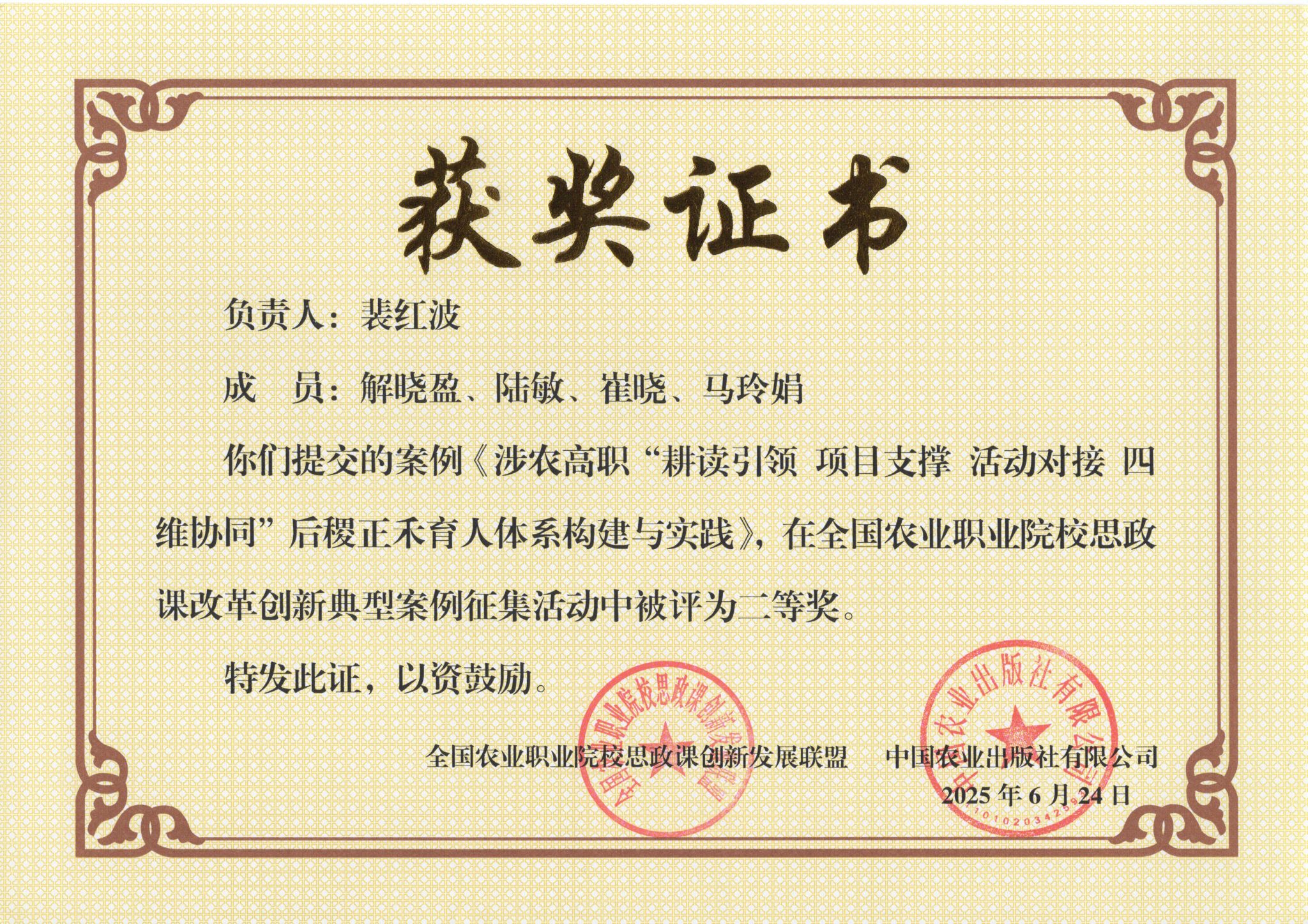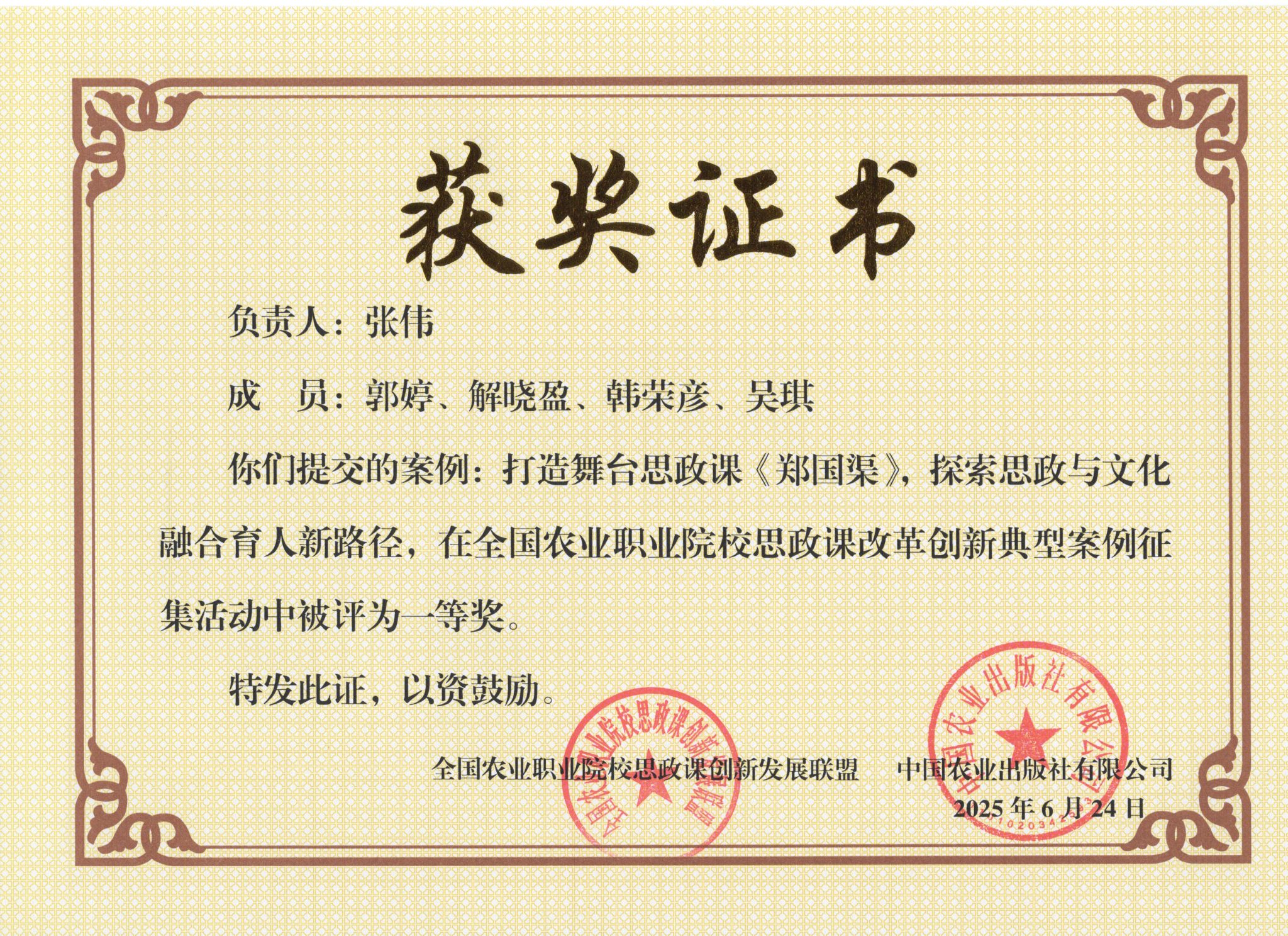 近日,全国农业职业院校思政课改革创新典型案例征集活动获奖名单公布,浦京《打造舞台思政课<郑国渠> 探索思政与文化融合育人新路径》获思政课教学模式与教学方法改革一等奖,《涉农高职“耕读引领 项目支撑 活动对接 四维协同”后稷正禾育人体系构建与实践》获“大思政课”建设二等奖。