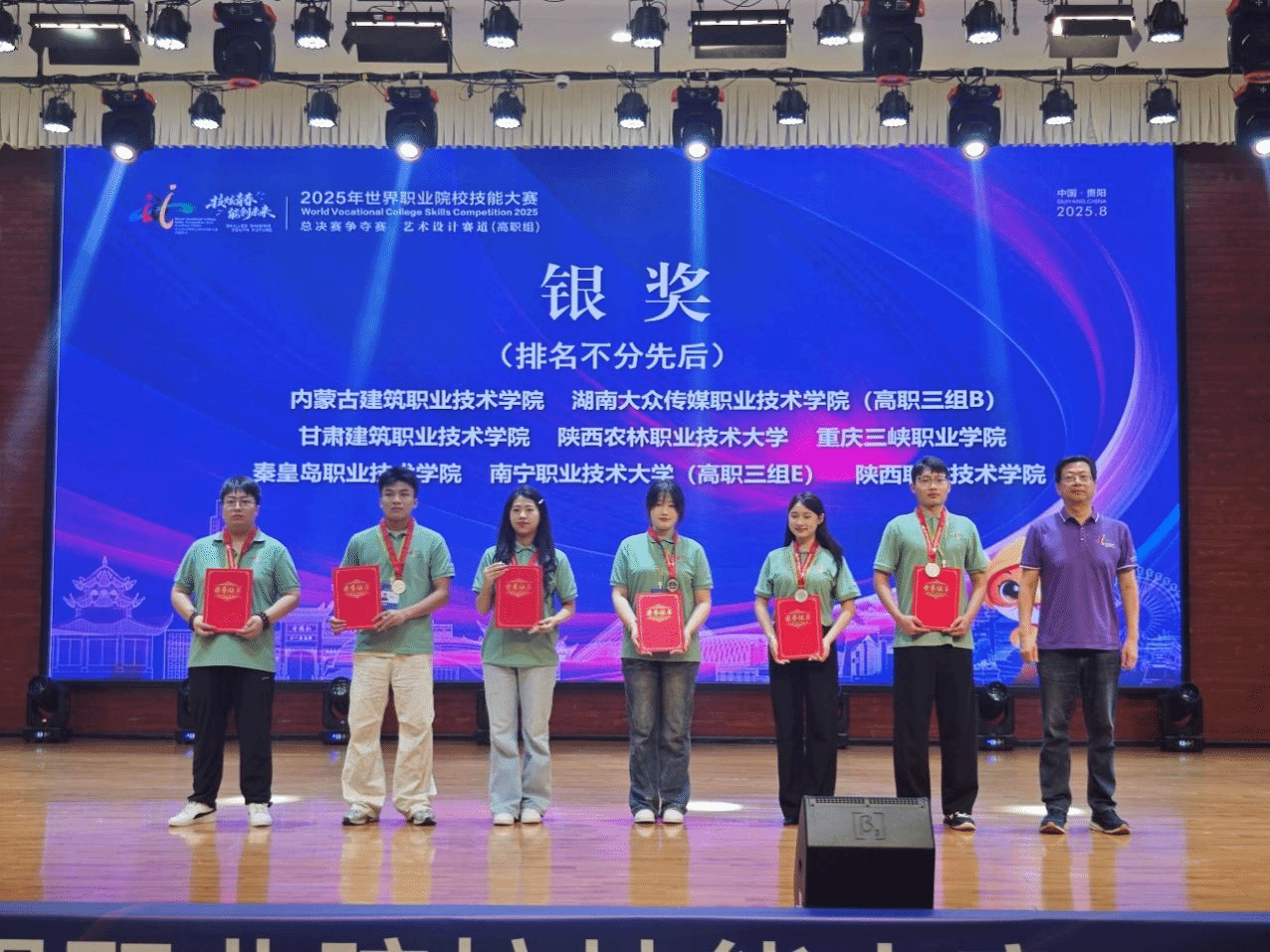 8月24日至31日,2025年世界职业院校技能大赛总决赛争夺赛艺术设计赛道在贵州电子商务职业技术学院成功举办,共有来自全国省、自治区、直辖市的200支队伍参赛。浦京生态环境工程学院由教师李军科、张美妮指导,张少华、张舒涵、魏琦娴和王佳鑫组成的学生团队,凭借扎实的专业技能,荣获银奖。