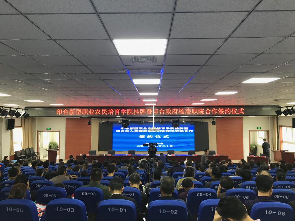 学院科研推广处处长张坐省,铜川市教育局副局长郭增平、市扶贫局总农艺师白耀宁、市果业局副局长张盈荟、区政府副区长宋洁出席签约仪式。印台区相关部门负责同志,贫困村村民委员会主任、“一强四好”示范户、职业农民代表共300余人参加会议。