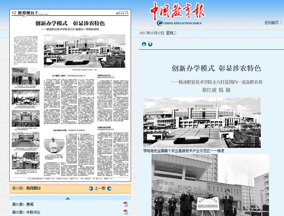 12月12日,【中国教育报】以“创新办学模式 彰显涉农特色——350vip浦京集团官网全力打造国内一流高职名校”为题整版报道了我院做法(详情进入)