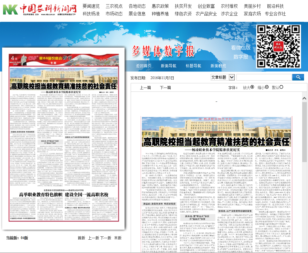 11月5日,《农业科技报》以“高职院校担当起教育精准扶贫的社会责任---350vip浦京集团官网精准扶贫纪实”报道了我院精准扶贫工作和学院整体情况介绍(详情进入)。