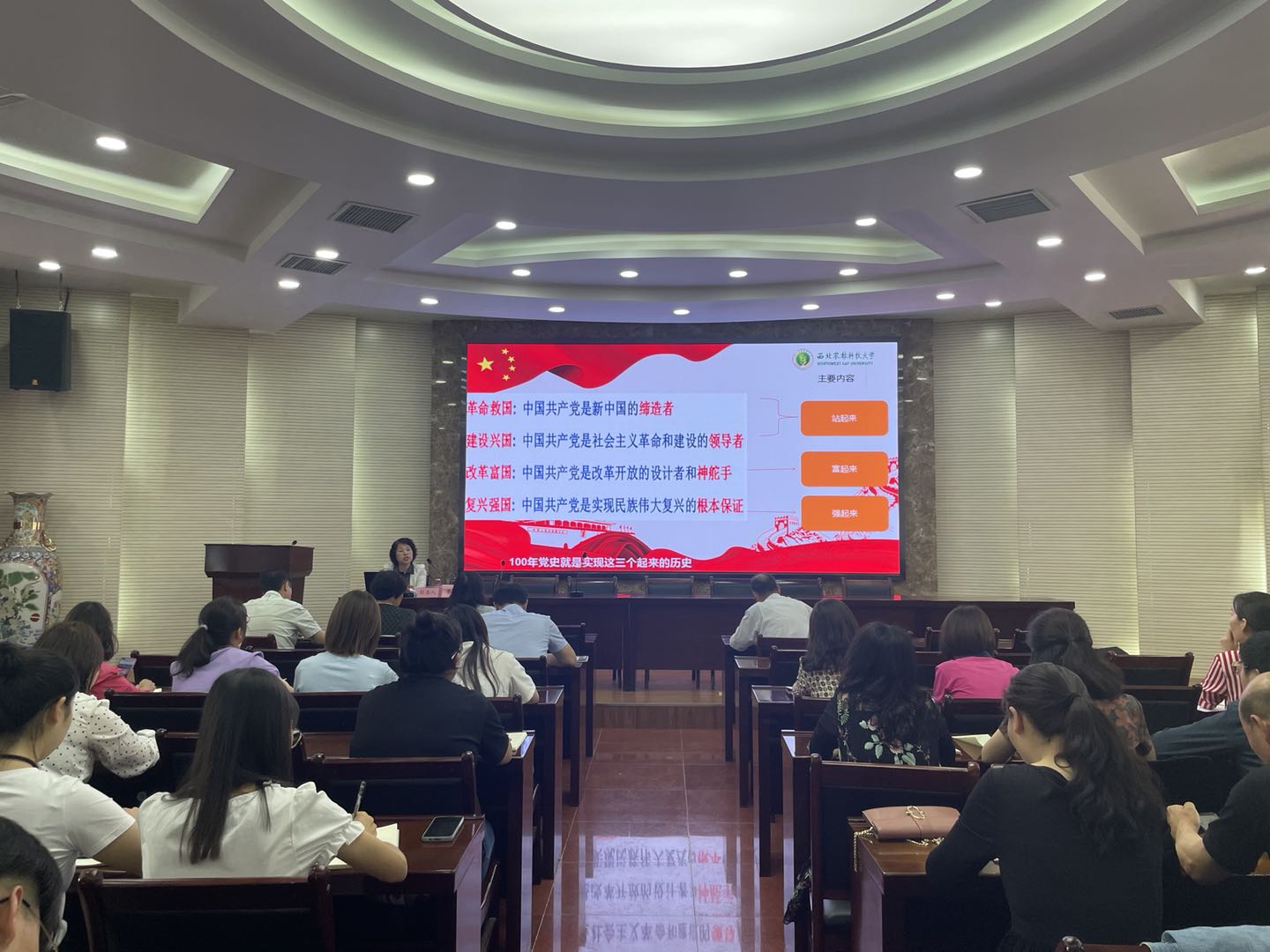 5月28日,旅游与管理学院在南校区水韵楼二楼报告厅举行党史学习教育专题报告会,邀请西北农林科技大学马克思主义学院教授李晓娥作题为《中国共产党百年辉煌——庆祝中国共产党成立100周年》的报告。院全体教师、学生党员共50余人聆听了报告
