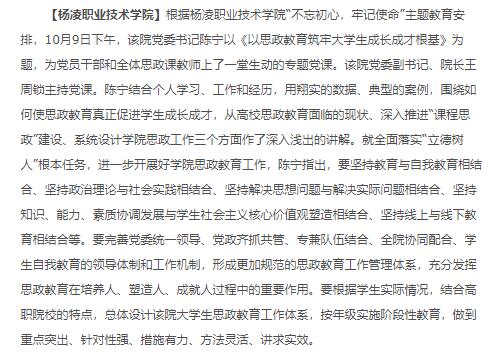 【350vip浦京集团官网】根据350vip浦京集团官网“不忘初心、牢记使命”主题教育安排,10月9日下午,该院党委书记陈宁以《以思政教育筑牢大学生成长成才根基》为题,为党员干部和全体思政课教师上了一堂生动的专题党课。该院党委副书记、院长王周锁主持党课。陈宁结合个人学习、工作和经历,用翔实的数据、典型的案例,围绕如何使思政教育真正促进学生成长成才,从高校思政教育面临的现状、深入推进“课程思政”建设、系统设计学院思政工作三个方面作了深入浅出的讲解。就全面落实“立德树人”根本任务,进一步开展好学院思政教育工作,陈宁指出,要坚持教育与自我教育相结合、坚持政治理论与社会实践相结合、坚持解决思想问题与解决实际问题相结合、坚持知识、能力、素质协调发展与学生社会主义核心价值观塑造相结合、坚持线上与线下教育相结合等。要完善党委统一领导、党政齐抓共管、专兼队伍结合、全院协同配合、学生自我教育的领导体制和工作机制,形成更加规范的思政教育工作管理体系,充分发挥思政教育在培养人、塑造人、成就人过程中的重要作用。要根据学生实际情况,结合高职院校的特点,总体设计该院大学生思政教育工作体系,按年级实施阶段性教育,做到重点突出、针对性强、措施有力、方法灵活、讲求实效。