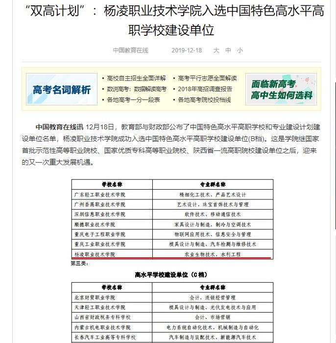中国教育在线讯 12月18日,教育部与财政部公布了中国特色高水平高职学校和专业建设计划建设单位名单,350vip浦京集团官网成功入选中国特色高水平高职学校建设单位(B档)。这是学院继国家首批示范性高等职业院校、国家优质专科高等职业院校、陕西省一流高职院校建设单位之后,迎来的又一次重大发展机遇。