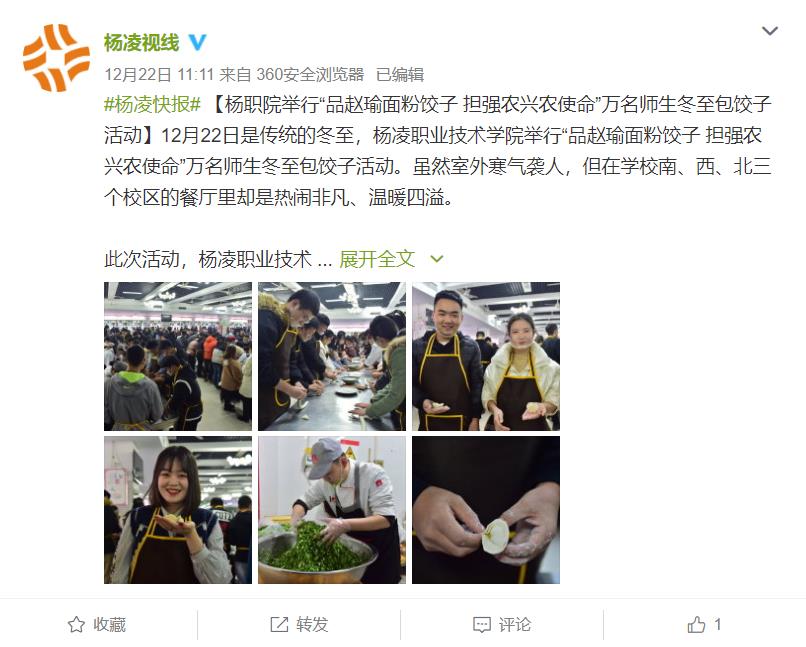 据了解,这是学校第二次举办此项活动,在这冬至这一天举办包饺子活动,使师生在包饺子、吃饺子的过程中,了解冬至传统文化习俗,体悟学院精神,把知农爱农的饱满热情转化为强农兴农的责任担当。(杨凌融媒体中心记者:张妮 万英俊)