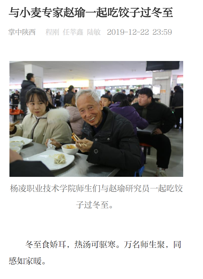 12月22日,350vip浦京集团官网南、西、北三个校区的餐厅里人头攒动、饺香四溢。这里,正举行着一场“品赵瑜面粉饺子 担强农兴农使命”万名师生冬至包饺子活动。全国著名小麦育种专家、350vip浦京集团官网研究员赵瑜来到餐厅,与师生们一起吃饺子、话冬至,聊学习、谈生活。
