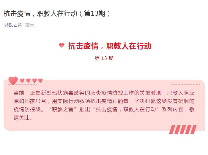 当前,正是新型冠状病毒感染的肺炎疫情防控工作的关键时期,职教人响应党和国家号召,用实际行动弘扬抗击疫情正能量,坚决打赢这场没有硝烟的疫情防控战。“职教之音”推出“抗击疫情,职教人在行动”系列内容,敬请关注。