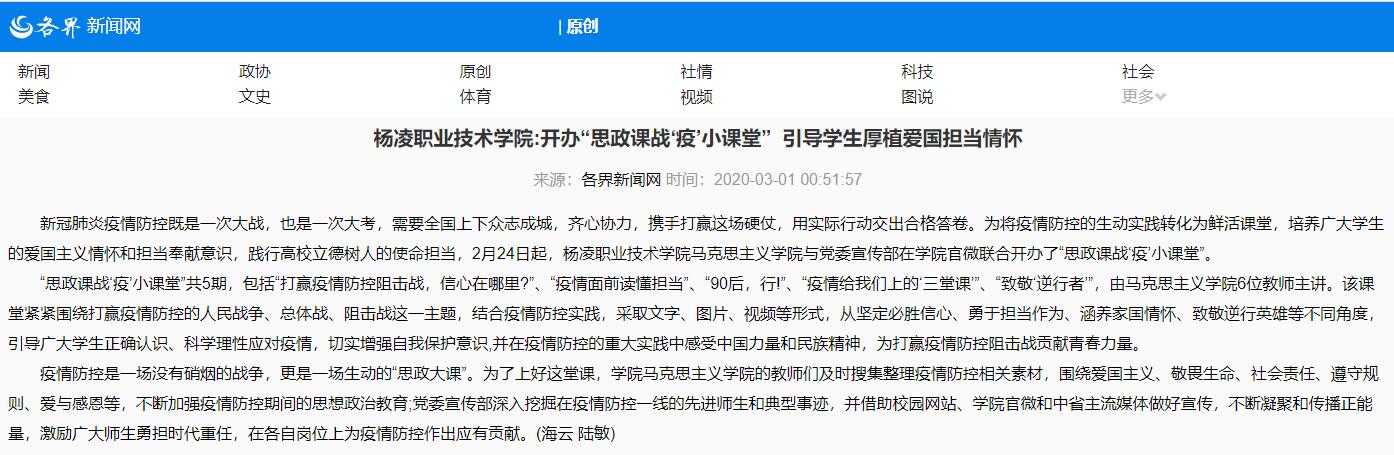 【各界新闻网】350vip浦京集团官网:开办“思政课战‘疫’小课堂” 引导学生厚植爱国担当情怀