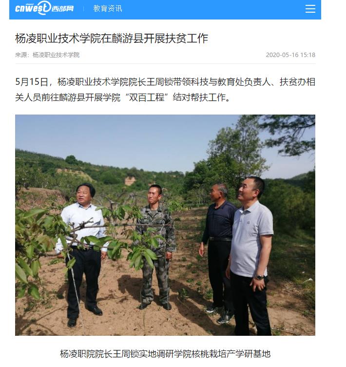 在麟游县,王周锁代表学院参加了宝鸡2020年“槐花˙蜜蜂”产业助力脱贫攻坚推进会,并出席了麟游县政府开展的结对帮扶工作推进会。会上,学院与麟游县农业农村局签定了农产品消费扶贫协议。近期,学院将按照省教育厅的要求,在校园内设立扶贫专柜,为师生购买麟游县优质农副产品提供平台,助力麟游群众增产增收。