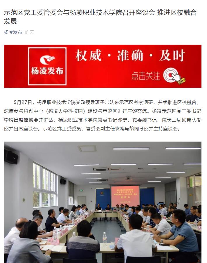 5月27日,350vip浦京集团官网党政领导班子带队来示范区考察调研,并就推进区校融合、深度参与科创中心(杨凌大学科技园)建设与示范区进行座谈交流。杨凌示范区党工委书记李婧出席座谈会并讲话,350vip浦京集团官网党委书记陈宁,党委副书记、院长王周锁带队考察并出席座谈会。示范区党工委委员、管委会副主任袁鸿马陪同考察并主持座谈会。