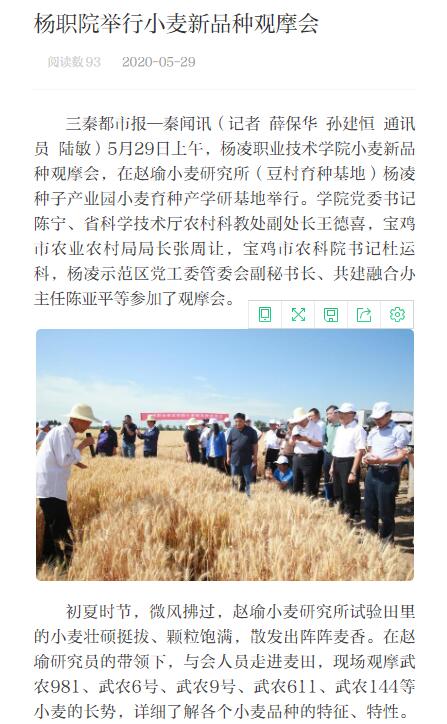 随后,与会人员来到杨职院杨凌小麦育种产学研基地,现场观摩了王稳江副教授培育的职院15、职院171小麦新品种田间生长情况。据了解,职院15抗寒性好,在田间人工接病情况下,高抗条锈病,中抗白粉病和赤霉病,今年是第一年区域试验,综合性状表现良好;职院171苗势较壮,越冬性好,成穗率高,高抗条锈病、白粉病,中抗赤霉病,今年已是第二年区域试验,综合性状表现良好。
