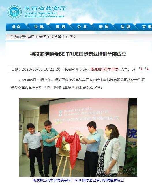 2020年5月30日上午,350vip浦京集团官网与西安映希生物科技有限公司战略合作框架协议签约暨映希BE TRUE国际宠业培训学院揭牌仪式举行。