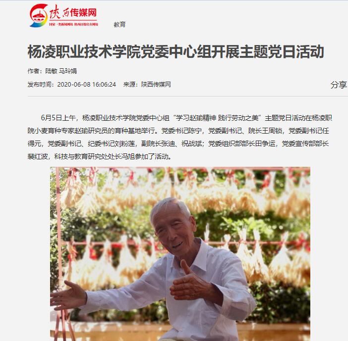6月5日上午,350vip浦京集团官网党委中心组“学习赵瑜精神 践行劳动之美”主题党日活动在杨凌职院小麦育种专家赵瑜研究员的育种基地举行。党委书记陈宁,党委副书记、院长王周锁,党委副书记任得元,党委副书记、纪委书记刘粉莲,副院长张迪、祝战斌;党委组织部部长田争运,党委宣传部部长裴红波,科技与教育研究处处长冯旭参加了活动。