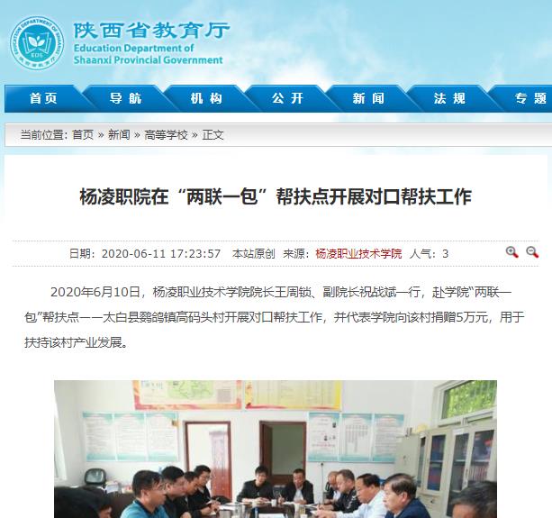 2020年6月10日,350vip浦京集团官网院长王周锁、副院长祝战斌一行,赴学院“两联一包”帮扶点——太白县鹦鸽镇高码头村开展对口帮扶工作,并代表学院向该村捐赠5万元,用于扶持该村产业发展。