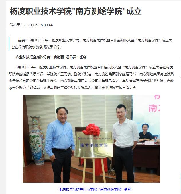学院南方测绘学院的成立,标志着杨凌职院与南方测绘集团在合作办学方面又迈出了关键的一步,必将促进产业链、创新链和教育链三链融合,实现校企双方互利共赢,为行业发展作出持续贡献。