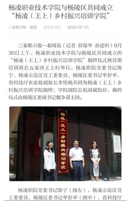此次杨凌职院与杨陵区共同成立“杨凌(王上)乡村振兴培训学院”,旨在充分发挥职教优势,进一步推进区校深度融合,打通高校、政府、乡村产业之间的天然阻隔,把科教力量延伸输送到田间地头,立足乡村振兴战略总要求,围绕农业强、农村美、农民富,扎实推进“五大振兴”。杨凌(王上)乡村振兴培训学院一是将面向杨陵区内外村干部、职业农民、新型经营主体、退役军人等,采用工学结合、育训结合等形式,通过百万扩招、函授教育、现代远程教育等方式进行学历提升教育;二是将面向杨陵区内外组织开展村干部、高素质农民、基层农技员、涉农企业、农业经理人、农业合作社、农文旅等相关从业人员的职业技能提升、职业素养培育等各类培训,聚力打造独具杨凌特色的乡村振兴模式,助推区域经济高质量发展。