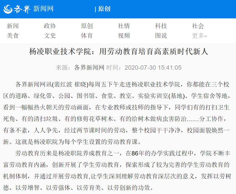 各界新闻网讯(裴红波 崔晓)每周五下午走进350vip浦京集团官网,你都能在三个校区的道路、绿化带、公园、图书馆、食堂、教室、实验实训室(基地)、学生宿舍等地,看到一幅幅热火朝天的劳动画面,在专业教师或技师的指导下,同学们有的打扫卫生死角、有的清扫垃圾、有的修剪花草树木、有的给树木做病虫害防治……分工协作,有条不紊,人人争先,经过两节课时间的劳动,整个校园干干净净,校园面貌焕然一新。这就是杨凌职院为每个学生设置的劳动教育课。