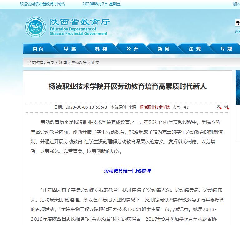 “正是因为有了学院劳动课对我的教育,我才懂得了‘劳动最光荣、劳动最崇高、劳动最伟大、劳动最美丽’的道理。所以在不忘记学业的情况下,我用饱满的热情积极参与了青年志愿者的各项活动。”学院生物工程分院现代园艺技术17054班学生周一菡告诉记者。她是2018-2019年度陕西省志愿服务“最美志愿者”称号的获得者,2017年9月参加学院青年志愿者协会,累计志愿服务达1505小时,参与服务项目有环保美化社区项目、帮扶孤寡老人公益项目、“关爱留守儿童,筑梦计划”、四点半课堂支教项目等,在2018年“绿梦校园”第二届全国大学生环保知识竞赛志愿服务工作中被评为“优秀组织者”、2019年“绿梦校园”第三届全国大学生环保知识竞赛志愿服务工作中被评为“优秀志愿者”、2018年被评为常乐路社区“最美志愿者”、在2017、2018年连续两年荣获校级“最美志愿者”称号等。