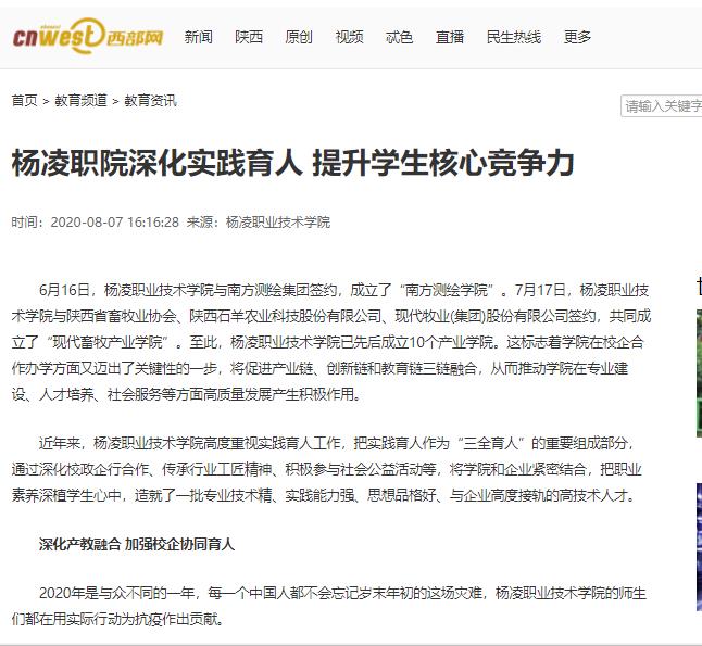 杨凌职院通过深化产教融合,加强校政行企合作,建立了校企深度融合的长效合作机制,使学生在校所学与行企实践有机结合,学院和企业实现优势互补、资源共享,在谋求自身发展的同时,实现与市场接轨,切实提高了育人的针对性和实效性,有效提升了应用型人才的培养质量。