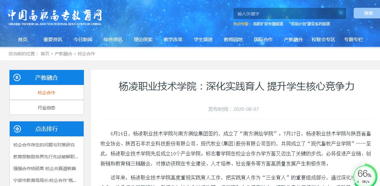 杨凌职院通过深化产教融合,加强校政行企合作,建立了校企深度融合的长效合作机制,使学生在校所学与行企实践有机结合,学院和企业实现优势互补、资源共享,在谋求自身发展的同时,实现与市场接轨,切实提高了育人的针对性和实效性,有效提升了应用型人才的培养质量。
