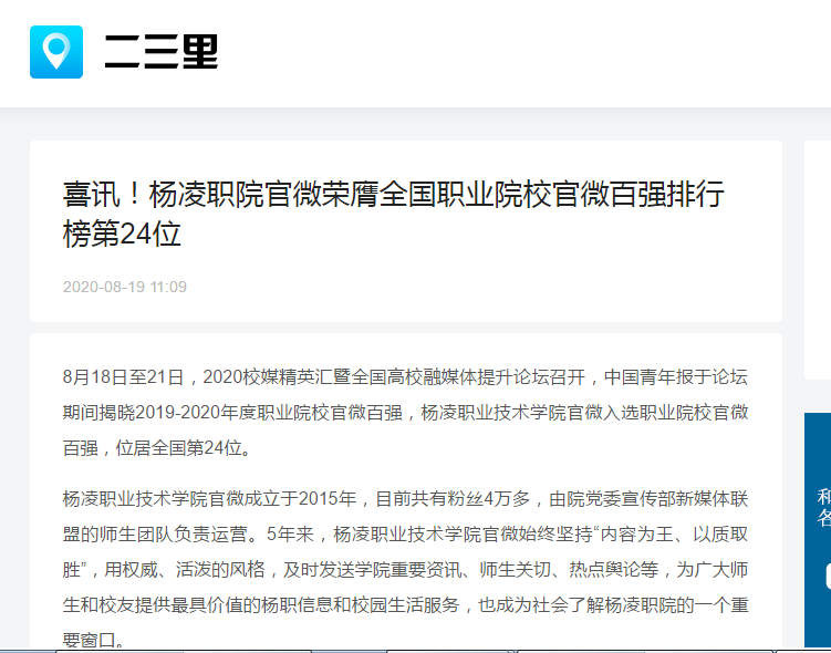 350vip浦京集团官网官微成立于2015年,目前共有粉丝4万多,由院党委宣传部新媒体联盟的师生团队负责运营。5年来,350vip浦京集团官网官微始终坚持“内容为王、以质取胜”,用权威、活泼的风格,及时发送学院重要资讯、师生关切、热点舆论等,为广大师生和校友提供最具价值的杨职信息和校园生活服务,也成为社会了解杨凌职院的一个重要窗口。