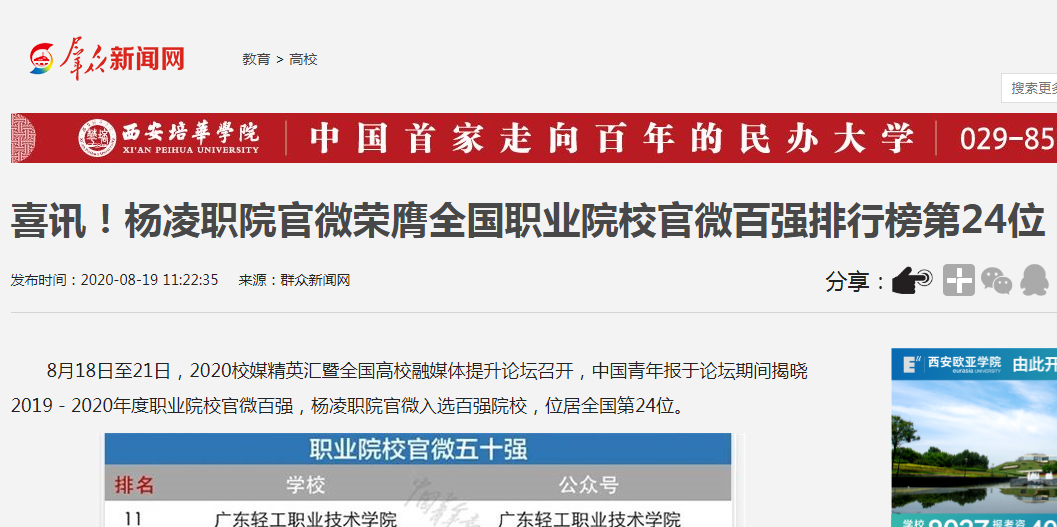 【群众新闻网】喜讯!杨凌职院官微荣膺全国职业院校官微百强排行榜第24位