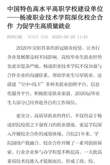 更充分、高质量就业的背后,不仅得益于杨凌职院疫情之下强有力的就业措施,更是学院深入开展校企合作的成效体现。合院21年来,学院围绕产教融合、校企合作开展了一系列创新探索,行业企业参与办学程度不断提高,一大批高素质技术技能人才脱颖而出,形成了政、校、企、行四方协同育人的格局,为学生毕业后能就业、就好业奠定了扎实基础。