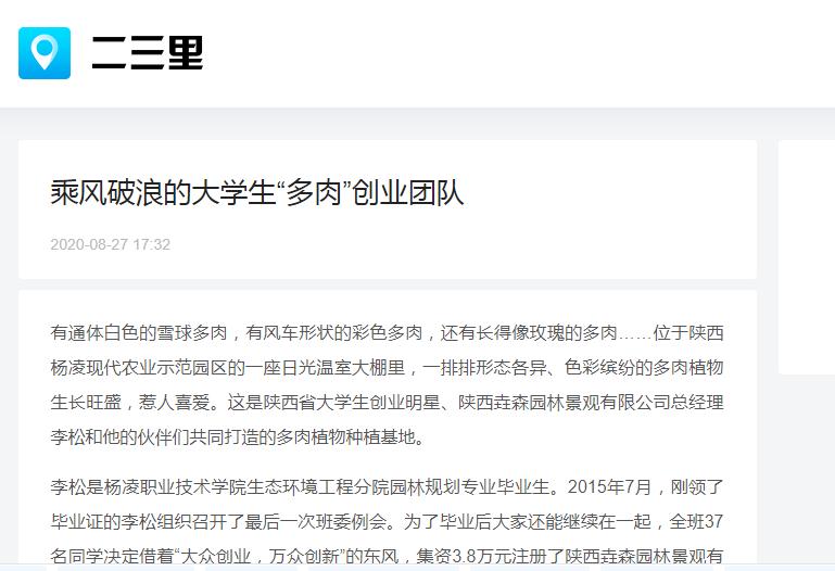 在创业这条大道上,这些青年风雨同舟,用智慧与汗水浇灌着梦想之花。目前公司在杨凌和上海已有8个大棚,100多个品种、34万株多肉植物,主营业务也从多肉植物的培育、研发、批发和销售,扩展到了多肉植物景观设计、家庭园艺设计、多肉植物花艺和多肉植物主题婚庆。