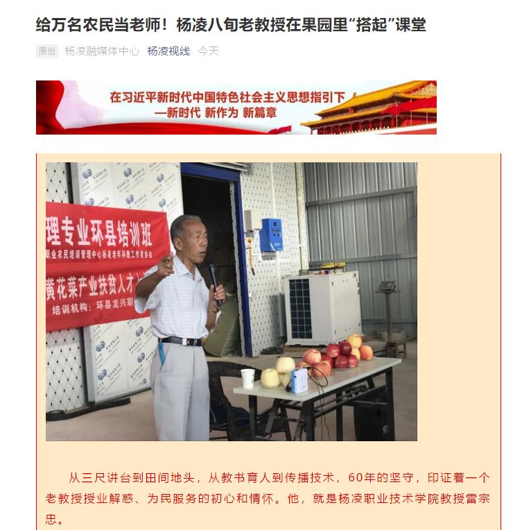 初秋时节,在武功县代家乡李家村金果子苗木合作社的果园里,围绕苹果后期管理的培训班正在进行中。讲课的就是雷宗忠教授,82岁的他精神矍铄,口齿清晰,台下的近百名种植户听得是津津有味。讲课结束后,他的铁杆“学生”王小明意犹未尽,和他一块到地里咨询苹果套袋的问题。