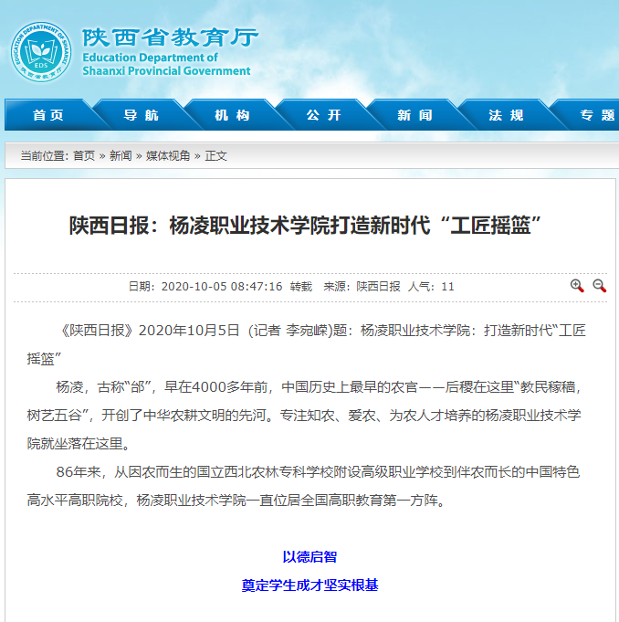 “我们不仅注重学生文化知识的学习和技能水平的提高,还将学习中国优秀传统文化、提高学生整体文化素养作为一项重点工作来抓。”杨职院党委书记陈宁说,“通过挖掘学校文化底蕴、丰富文化育人内容、创新文化育人载体等,润物无声地滋养学生心灵。”