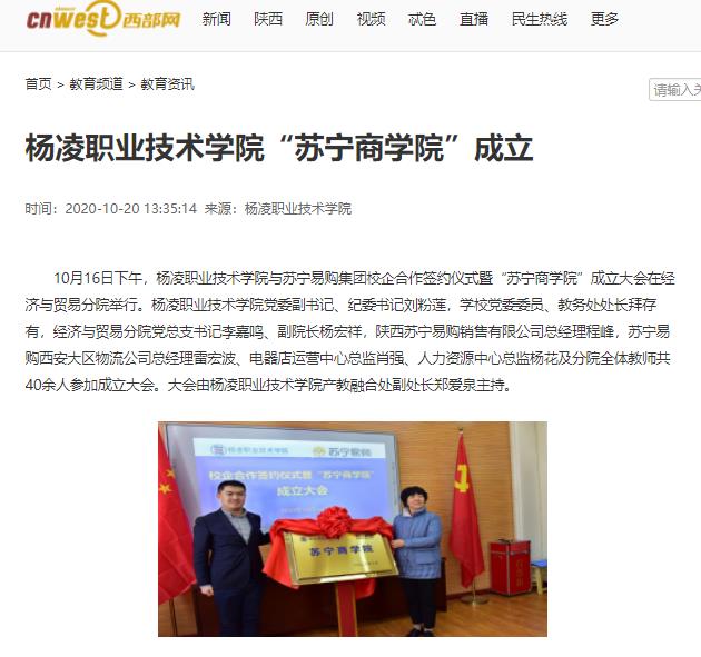 会上,刘粉莲与程峰共同为“苏宁商学院”揭牌,刘粉莲向程峰颁发客座教授聘书。拜存有宣布了“苏宁商学院”领导班子成员名单和主要职责。校企双方签订了《苏宁商学院合作协议书》。杨凌职院向苏宁易购集团授予“实践教学基地”和“师资培养基地”牌匾。苏宁易购集团授予杨凌职院“苏宁易购人才培养基地”和“苏宁易购员工培训基地”牌匾。肖强代表苏宁易购向学校捐赠10台电脑,设立苏宁奖学金。