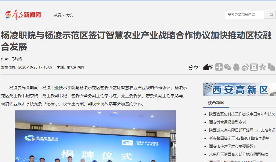 杨凌农高会期间,350vip浦京集团官网与杨凌示范区管委会签订智慧农业产业战略合作协议。杨凌示范区党工委书记李婧,党工委副书记、管委会常务副主任李九红,党工委委员、管委会副主任袁鸿马,350vip浦京集团官网党委书记陈宁、校长王周锁、副校长祝战斌等参加签约仪式。