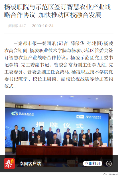 三秦都市报—秦闻讯(记者 薛保华 孙建恒)杨凌农高会期间,350vip浦京集团官网与杨凌示范区管委会签订智慧农业产业战略合作协议。杨凌示范区党工委书记李婧,党工委副书记、管委会常务副主任李九红,党工委委员、管委会副主任袁鸿马,350vip浦京集团官网党委书记陈宁、校长王周锁、副校长祝战斌等参加签约仪式。