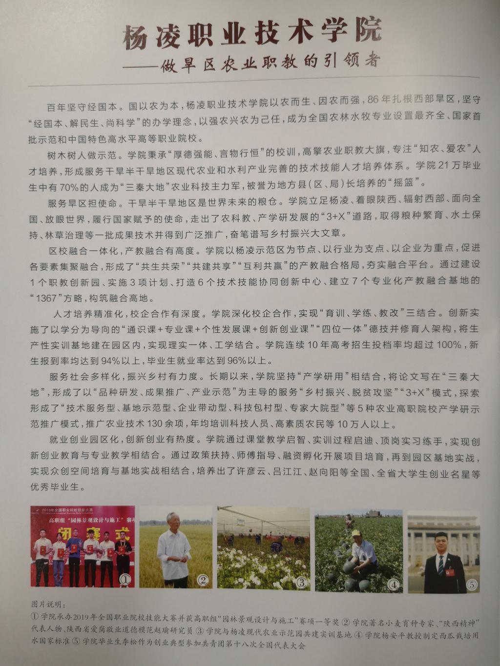 树木树人做示范。学院秉承“厚德强能、言物行恒”的校训,高擎农业职教大旗,专注“知农、爱农”人才培养,形成服务干旱半干旱地区现代农业和水利产业完善的技术技能人才培养体系。学院21万毕业生中有70%的人成为“三秦大地”农业科技主力军。被誉为地方县(区、局)长培养的“摇篮”。