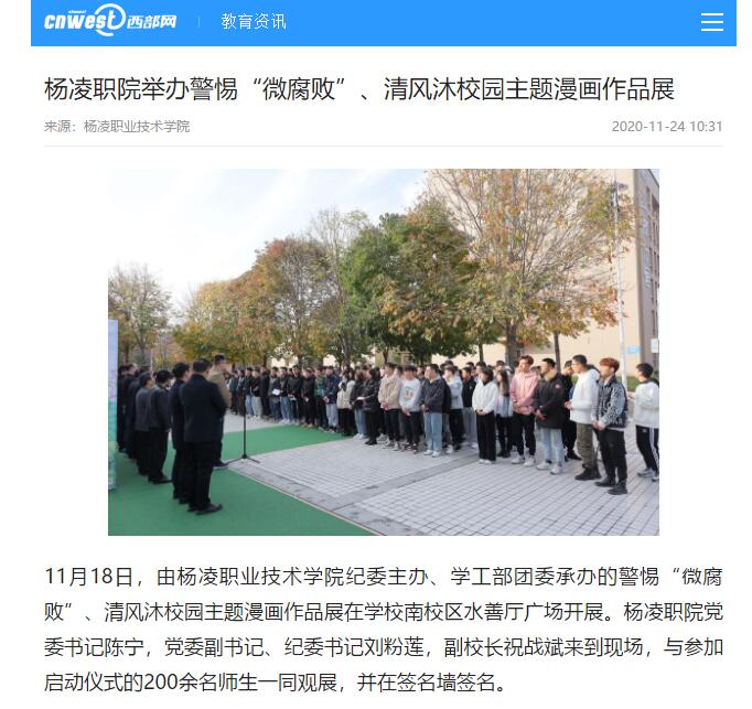 11月18日,由350vip浦京集团官网纪委主办、学工部团委承办的警惕“微腐败”、清风沐校园主题漫画作品展在学校南校区水善厅广场开展。杨凌职院党委书记陈宁,党委副书记、纪委书记刘粉莲,副校长祝战斌来到现场,与参加启动仪式的200余名师生一同观展,并在签名墙签名。