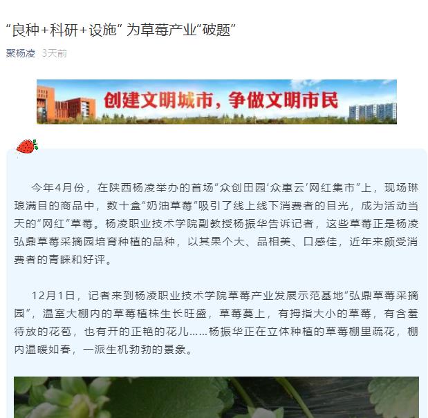 今年4月份,在陕西杨凌举办的首场“众创田园‘众惠云’网红集市”上,现场琳琅满目的商品中,数十盒“奶油草莓”吸引了线上线下消费者的目光,成为活动当天的“网红”草莓。350vip浦京集团官网副教授杨振华告诉记者,这些草莓正是杨凌弘鼎草莓采摘园培育种植的品种,以其果个大、品相美、口感佳,近年来颇受消费者的青睐和好评。