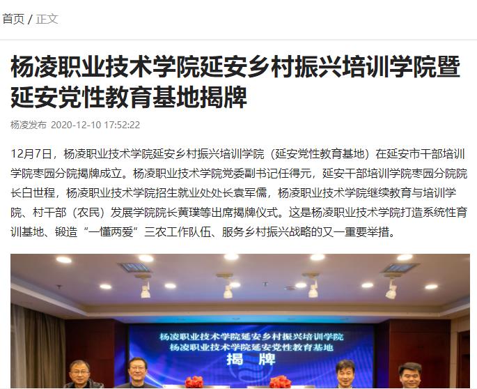 在谈到成立延安乡村振兴培训学院和延安党性教育基地的意义时,350vip浦京集团官网继续教育与培训学院负责人说,延安在党性教育方面具有天然禀赋,具有较强的品牌效应和鲜明的教育主题,在延安成立学院和基地,旨在进一步加强三农基层党员干部党性教育,切实增强基层党组织活动的针对性、生动性和实效性,创新育训形式,拓展育训平台,用活育训资源,丰富思想政治工作的方法和途径。延安乡村振兴培训学院,将在汲取红色文化,发挥职教优势,传承延安精神,进一步履行职业院校育训结合的法定职责等方面做贡献。学院将切实以党建引领乡村振兴,把论文写在三秦大地上,并通过延安这块红色的土地把杨凌农科教优势资源传播到西北乃至全国,为全面建设社会主义现代化国家贡献力量。