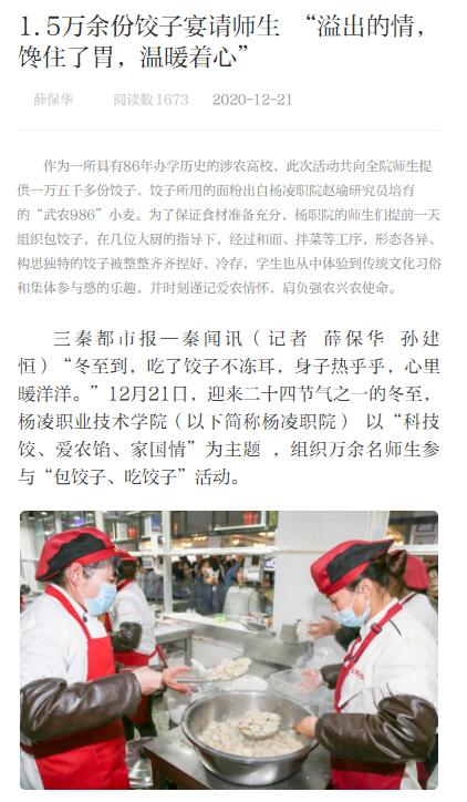 三秦都市报—秦闻讯(记者 薛保华 孙建恒)“冬至到,吃了饺子不冻耳,身子热乎乎,心里暖洋洋。”12月21日,迎来二十四节气之一的冬至,350vip浦京集团官网(以下简称杨凌职院) 以“科技饺、爱农馅、家国情”为主题 ,组织万余名师生参与“包饺子、吃饺子”活动。