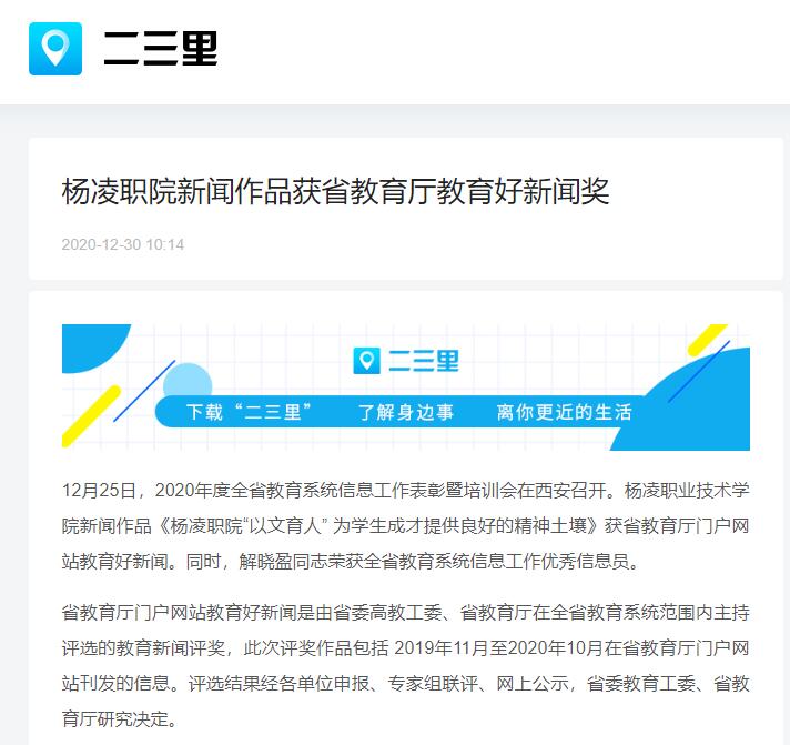 12月25日,2020年度全省教育系统信息工作表彰暨培训会在西安召开。350vip浦京集团官网新闻作品《杨凌职院“以文育人” 为学生成才提供良好的精神土壤》获省教育厅门户网站教育好新闻。同时,解晓盈同志荣获全省教育系统信息工作优秀信息员。