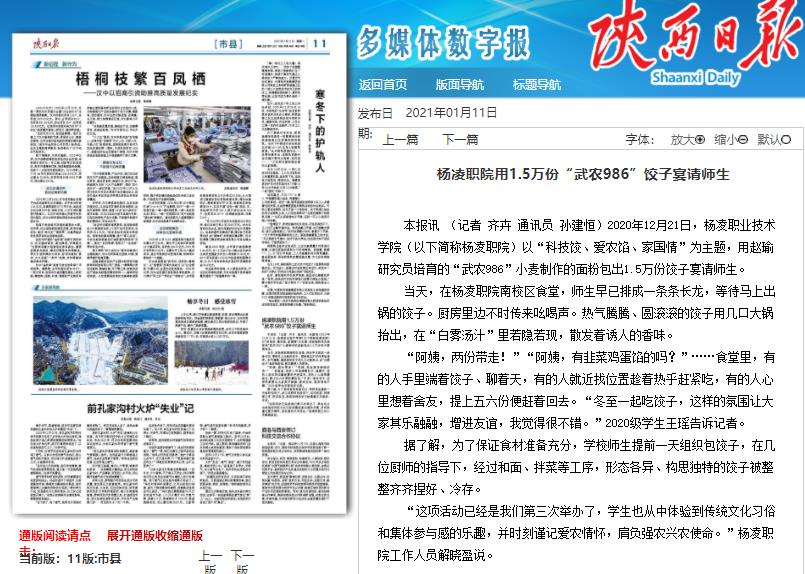 本报讯 (记者 齐卉 通讯员 孙建恒)2020年12月21日,350vip浦京集团官网(以下简称杨凌职院)以“科技饺、爱农馅、家国情”为主题,用赵瑜研究员培育的“武农986”小麦制作的面粉包出1.5万份饺子宴请师生。