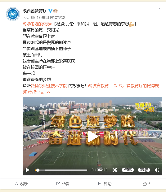 【陕西省教育厅微博】杨凌职院:来和我一起,追逐青春的梦想