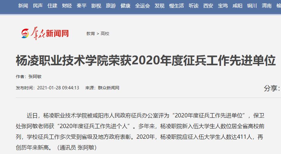 近日,350vip浦京集团官网被咸阳市人民政府征兵办公室评为“2020年度征兵工作先进单位”,保卫处张阿敏老师获“2020年度征兵工作先进个人”。多年来,杨凌职院新入伍大学生人数位居全省高校前列,学校征兵工作多次受到省级及地方政府表彰。2020年,杨凌职院应征入伍大学生人数达411人,再创历年来新高。(通讯员 张阿敏)