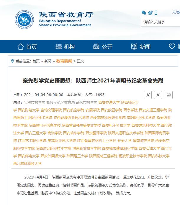 【350vip浦京集团官网】清明期间,该院开展了“清明祭英烈”系列主题宣传教育活动。一是开展网上祭英烈活动。4月1日至4月6日,组织广大师生积极参与陕西文明网开设的“网上祭英烈”活动,进行网上祭奠、发表祭奠感言,激发爱党爱国情感,增强爱党爱国意识。参加活动人次达1万余人。二是赴扶眉烈士陵园开展党史学习教育主题活动。3月31日,党委学工部(处)、校团委组织各学院学工办主任、副主任,团总支书记、副书记、新入职辅导员以及学生党员、团员代表共80余人在扶眉烈士陵园,围绕“祭英烈、学党史、悟思想”主题,全体师生奏唱国歌,敬献花篮,默哀并三鞠躬,表达对革命先烈崇高的敬意和深切的悼念之情。缅怀革命先烈的英雄事迹,旨在鼓舞师生斗志,激发师生爱国奉献情怀,继承革命英烈遗志,进一步坚定理想信念,增强责任感和使命感,为学院高质量发展贡献自己的一份力量,使学生工作、共青团工作取得更大的成绩。三是开展以“缅怀革命先烈,弘扬爱国精神”为主题的祭扫活动。4月2日,药物与化工学院在杨凌烈士陵园组织开展了以“缅怀革命先烈,弘扬爱国精神”为主题的祭扫活动。同学们到烈士纪念碑前奏唱《中华人民共和国》国歌、鞠躬默哀,缅怀各位英勇烈士们为了革命事业抛头颅、洒热血的仁人志士和革命烈士的英雄事迹。