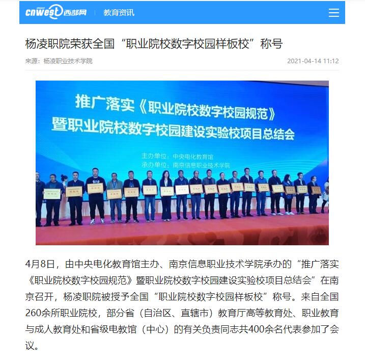 4月8日,由中央电化教育馆主办、南京信息职业技术学院承办的“推广落实《职业院校数字校园规范》暨职业院校数字校园建设实验校项目总结会”在南京召开,杨凌职院被授予全国“职业院校数字校园样板校”称号。来自全国260余所职业院校,部分省(自治区、直辖市)教育厅高等教育处、职业教育与成人教育处和省级电教馆(中心)的有关负责同志共400余名代表参加了会议。