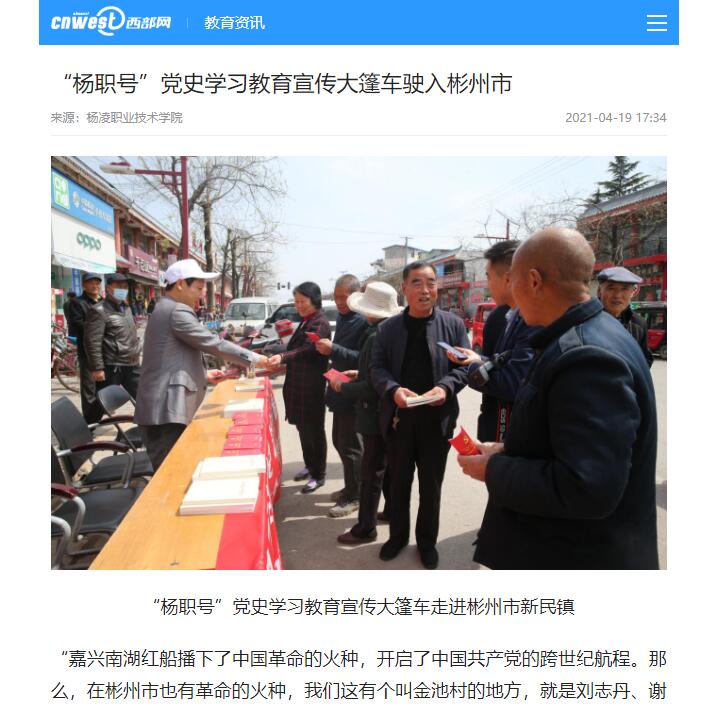 “杨职号”党史学习教育宣传大篷车是杨凌职院党委宣传部、科技与教育研究处、马克思主义学院,面向农村打造的党史学习教育“移动课堂”,宣讲成员为马克思主义学院教师和学校党员志愿者,主要结合当地的红色革命故事宣讲党的百年历史,使大家能听懂、易吸收,让党史教育在基层落地有“声”,引导广大党员群众重温革命传统、传承革命精神、凝聚奋进力量。据了解,“杨职号”党史学习教育宣传大篷车将继续走进杨凌及周边镇村。