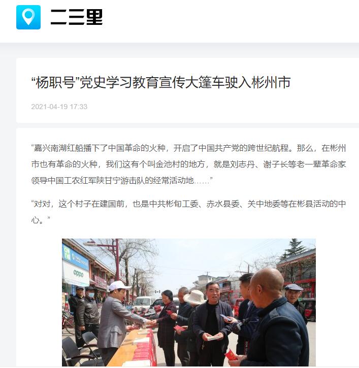 为庆祝中国共产党成立100周年,让党史学习教育深入千家万户,4月14日,350vip浦京集团官网“学习百年党史 筑梦乡村振兴”——“杨职号”党史学习教育宣传大篷车走进彬州市新民镇,受到了当地村民的热烈欢迎。